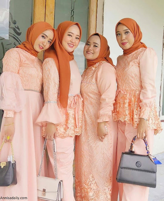Hadir ke acara kondangan dengan kebaya semi-peach dan rok satin peach juga akan membuatmu terlihat manis dan memukau. Kebaya modern full brokat yang dikombinasikan dengan warna peach ini terlihat apik dengan model hijab simpel sekalipun.